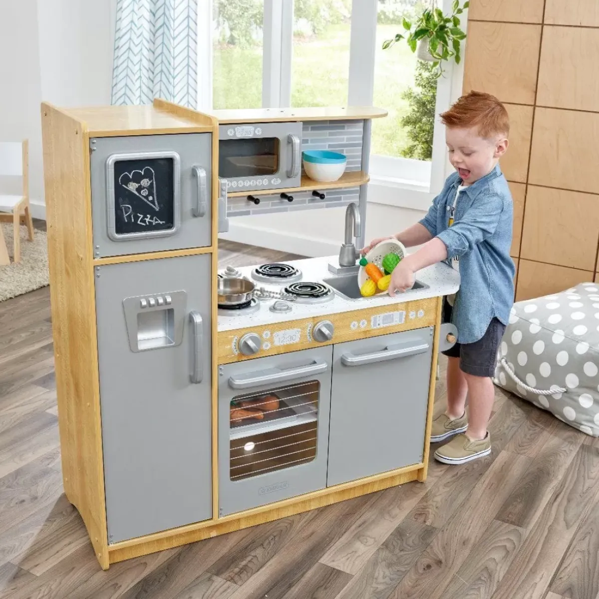 Time To Cook Up A Little Fun! Our Kidkraft Uptown Natural Play Kitchen Has A Hip, Modern Look That Young Chefs Are Sure To Love. With Tile-Look Backsplash And Sleek Countertops, The Design Is Emulated From Trendy Real-Life Kitchens. Every Appliance Is Interactive, Including Doors That Open And Close, Knobs That Turn And Click And A Working Chalkboard On The Freezer Door. Kids Will Love Taking Calls On The Cordless Play Phone That Attaches To The Side Of The Refrigerator. Keep All Accessories Neat And Handy With The Pegs For Hanging Utensils And The Side Towel Rack. Crafted From Composite Wood, The Uptown Natural Contemporary Kitchen Is A Sturdy And Stylish Addition To Playtime.