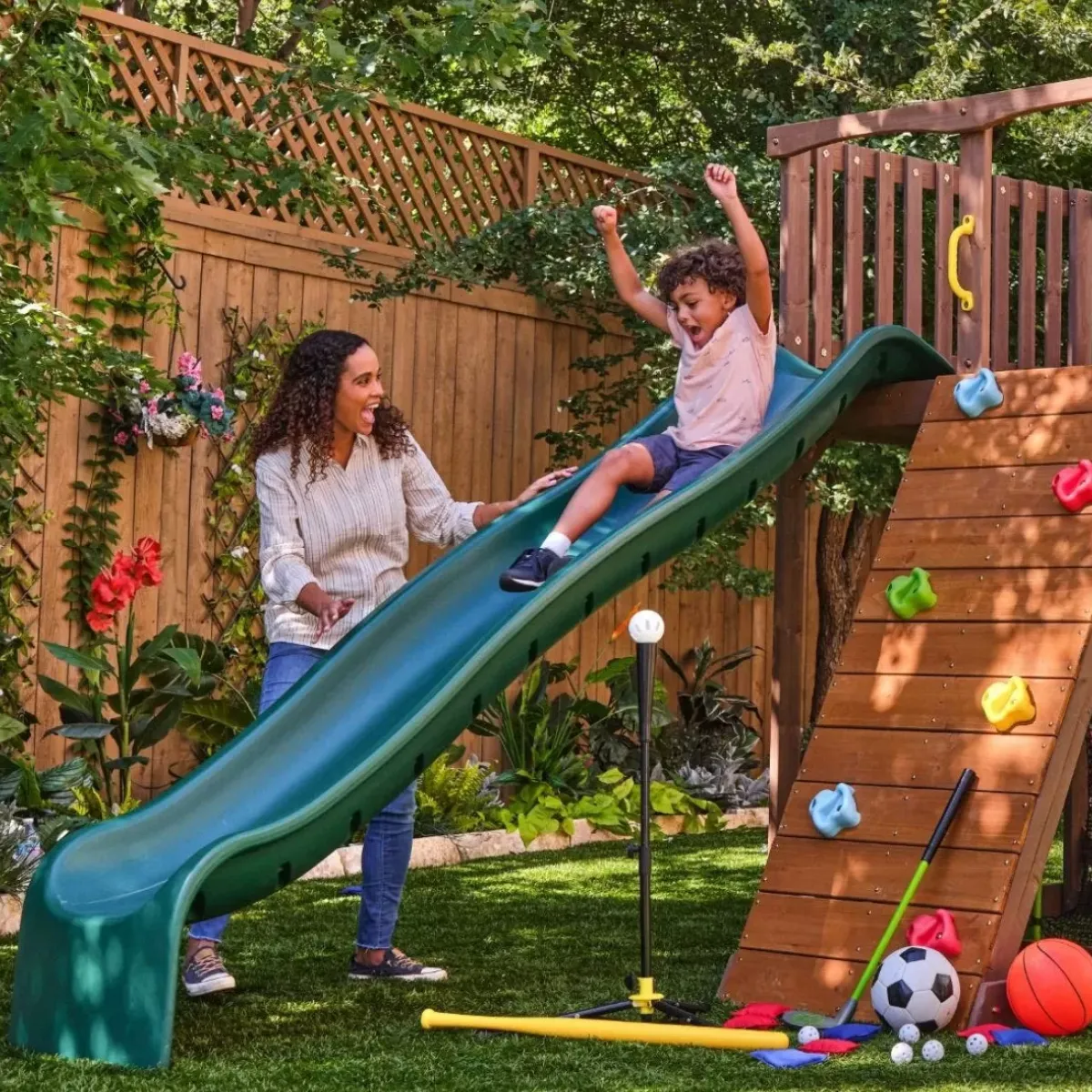 The Kidkraft All-In-One Sports Adventure Playset Is Like Having A Sports Arena And A Playground In Your Very Own Backyard. This Wooden Outdoor Set Has Everything To Practice, Play And Compete In Multiple Sports. Host A Game Night With Family And Friends. Instead Of Card Or Board Games Around A Table, Take The Play To The Backyard With A Bevy Of Sports: Baseball, Basketball, Football, Golf And Soccer. Yet, You Still Have The Much-Loved Play Aspects Of A Traditional Set: Slide, Ladder, Rock Wall And Deck. It’s A Win-Win For Everyone. Practice Your Throwing And Pitching Aim With The Various-Sized Holes In The Tarp To Score Mega Points. All The Equipment You Need Is Included To Get Playing Right Away. There’s Even A Storage Net To Keep Everything Neat And Handy After Games Are Over. The Expansive Upper Deck And Shaded Lower Area Give Benchwarmers And Spectators An Awesome Spot To Rest And Wait For Their Turn. Score Major Points With Your Kids When You Install The All-In-One Sports Adventure Playset On Your Home Turf.