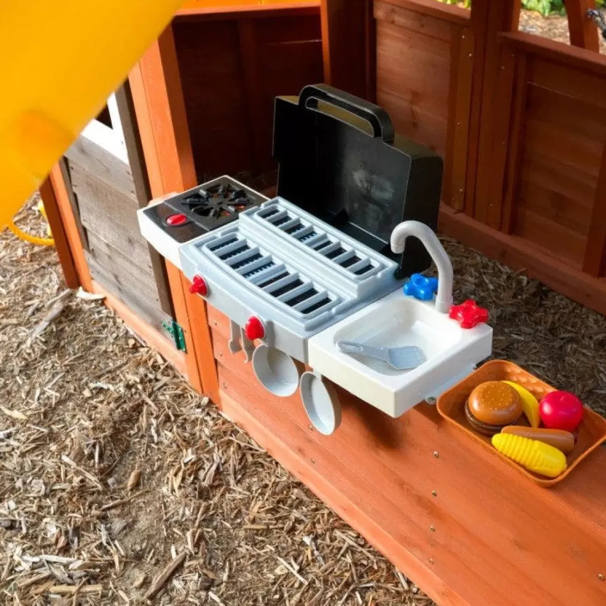 Let Kids Experience The Ultimate In Backyard Fun With The Kidkraft Lookout Extreme Playset. Boasting A Paramount Three Stories To Accommodate A Record 16 Kids, This Adventure Station Includes A Trio Of Slides, Swings And Multiple Ways To Climb To The Top. Kids Will Have No Trouble Sharing Since There Are So Many Options For Play. Maybe They’Ll Opt For A Belt Swing Or An Acro Bar To Soar To New Heights. A Double Ride Slide Lets Friends Challenge Each Other To A Race. For An Even More Thrilling Ride, They Can Try Out The Twist-N-Ride Tube Slide. The Lower Clubhouse Welcomes Guests With A Windowed Door And Ringing Bell. Kids Will Love The Play Bbq Cooking Area With Sink. A Hanging Pot, Pan And Spatula Is Included To Complete The Chef Experience. When It’s Time To Ascend To The Second Level, Kids Can Choose Between Varying Degrees Of Climbing Excitement.