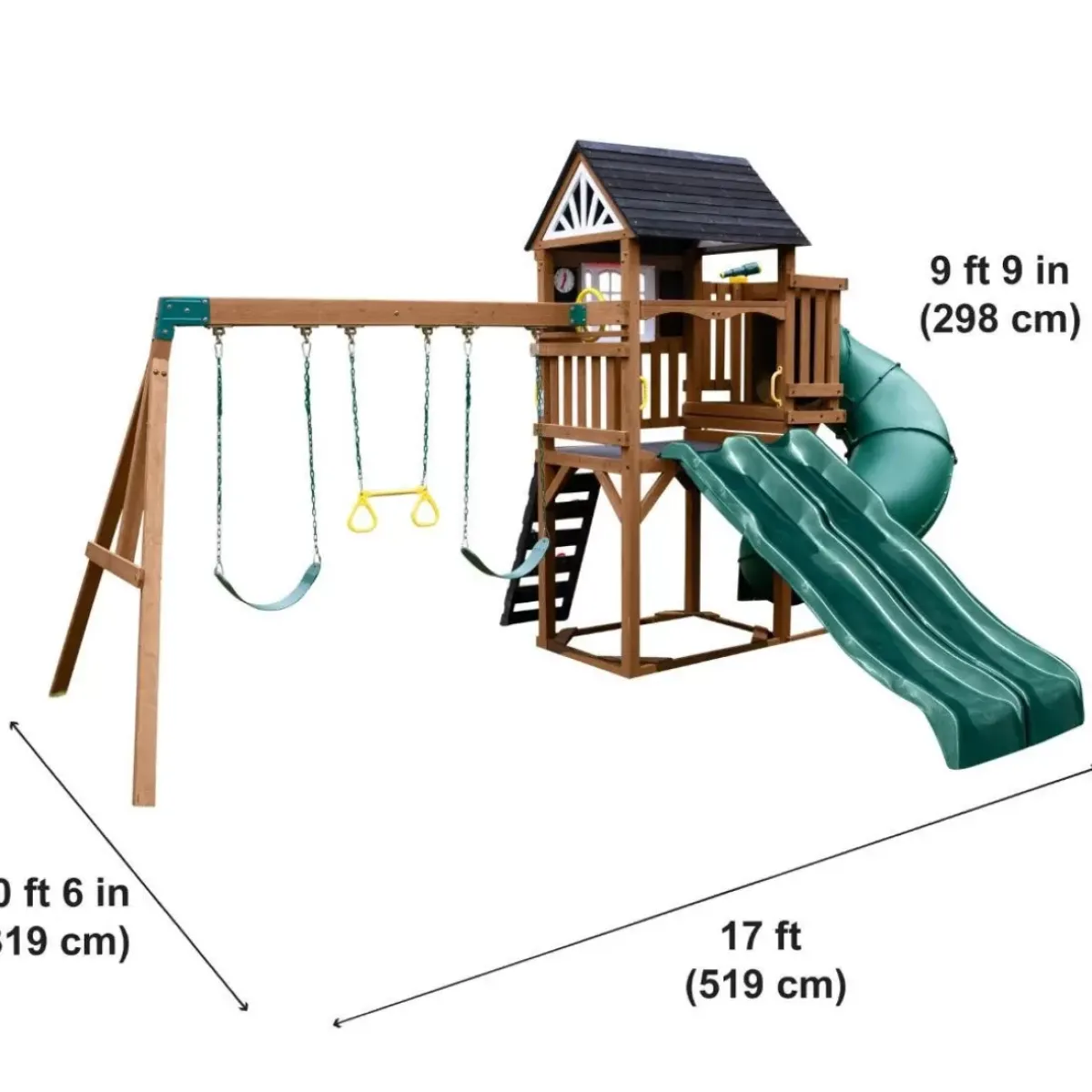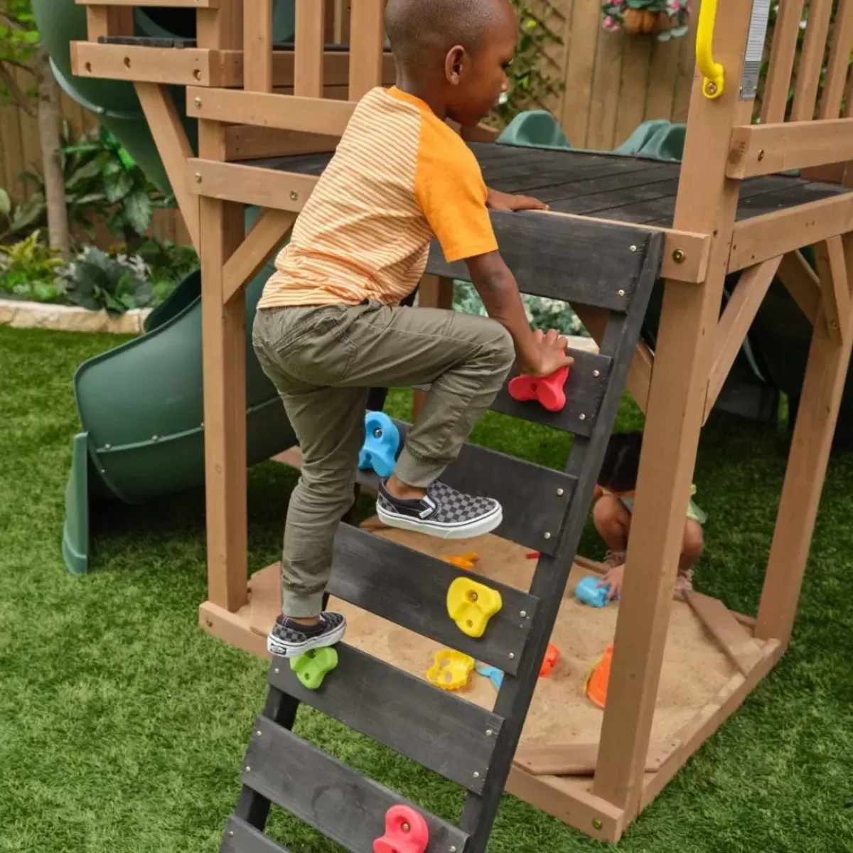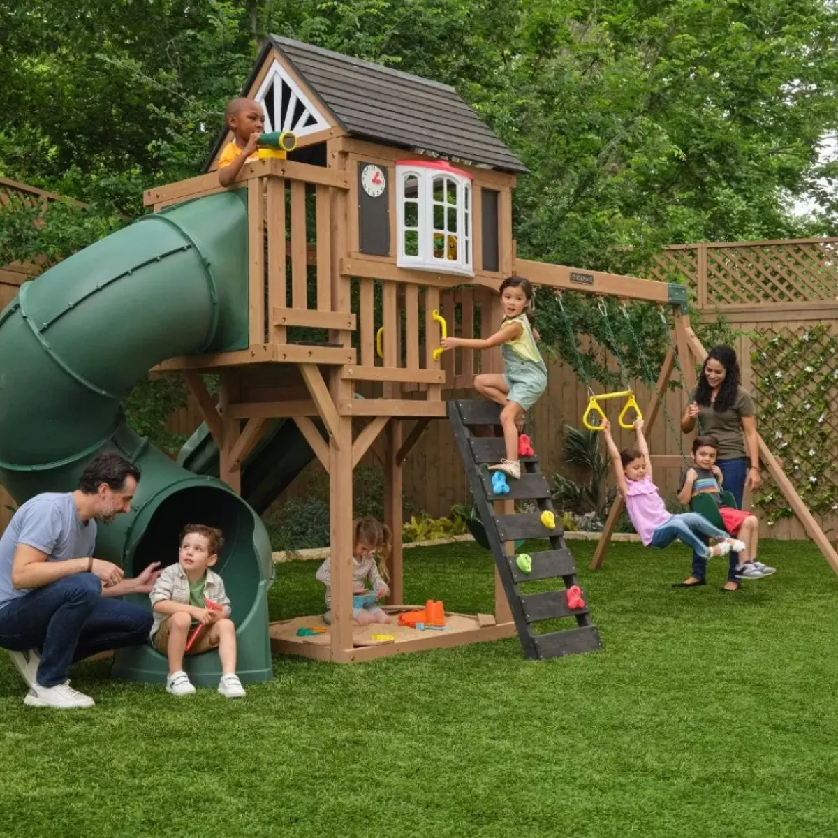 Trying To Decide Whether To Get Your Kids A Swing Set Or A Playhouse? Well, With The Kidkraft Timberlake Swing Set, You Don’T Have To Compromise. This Wooden Outdoor Playset Offers Up All The Features That Both You And Your Kids Want In The Backyard. With Three Swinging Options, Three Slides, Rock Wall And Clubhouse, It’Ll Keep Children Busy Outside From Sunup To Sundown. Invite Friends Over Even—There’s Plenty Of Room For Sharing! The Two Wavy Slides Even Encourage A Little Friendly Racing Competition. Ascend To The Playhouse Via The Ladder/Rock Wall Combo And Watch Imagination Come Alive. Pretend You’Re In The Jungle Researching A New Species Of Monkeys Or You’Re Simply Living In A Remote Treehouse. Then, Take The Twisty Wave Slide (Or Pretend It’s A Waterfall) To The Ground And Run Around To The Swings To Take To The Skies. And, Since The Structure Is Made Of Wood And Includes A Limited 5-Year Warranty, You Know There’Ll Be Plenty Of Days For Even More Active Fun.