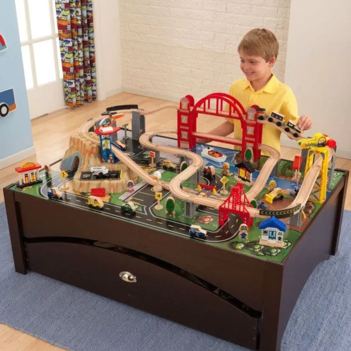 It’s A Busy, Busy World In The Kidkraft Metropolis Train Table Set. This Urban Scene Comes With 100 Colorful Pieces, Including The Magnetic Three-Car Train That Glides Above The Town On The Elevated Track. A Double-Decker Suspension Bridge And Tall Mountain Give Even Greater Height To This Towering Railroad. Many Modes Of Transportation Are Represented Including A Helicopter, Airplane And Boat. There Are Townspeople To Greet And Majestic Scenery To See. Each Piece Is Crafted For Fun And Safety, And The Whole Set Packs Neatly Away In The Jumbo Storage Drawer When Not In Play. Then Kids Can Enjoy The Graphically Detailed Surface For Vehicle Or Imaginative Play. Every Day Is An Adventure With The Kidkraft Metropolis Train Table Set.