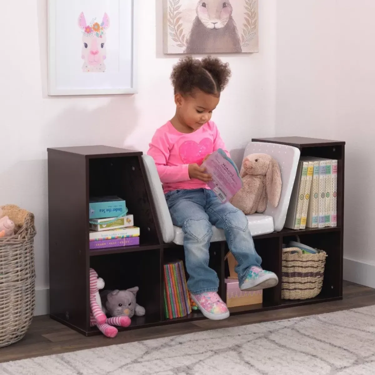 The Kidkraft Bookcase With Reading Nook Is Popular With Parents Because Of Its Clever Design, Sturdy Construction And Aesthetic Appeal. Combining A Cushioned Seating Area With Bookshelves Gives You Two Spaces In One Furniture Piece. Kids Can Store Books, Toys, Blankets And More In The Six Shelves, Then Curl Up On The Three-Sided Angled Middle Section To Read Or Rest. The Two Tall Shelves On The Sides Are Perfect For Accommodating Taller Picture Books. Place A Lamp On The Top Sides For Cozy Light. Three Gray Cushions Stay Securely Onto The Base With Self-Adhesive Strips. Available In Trend-Right Colors To Match Your Home’s Decor, The Bookcase With Reading Nook Will Help Keep Any Kids Room Or Playroom Organized And Neat.