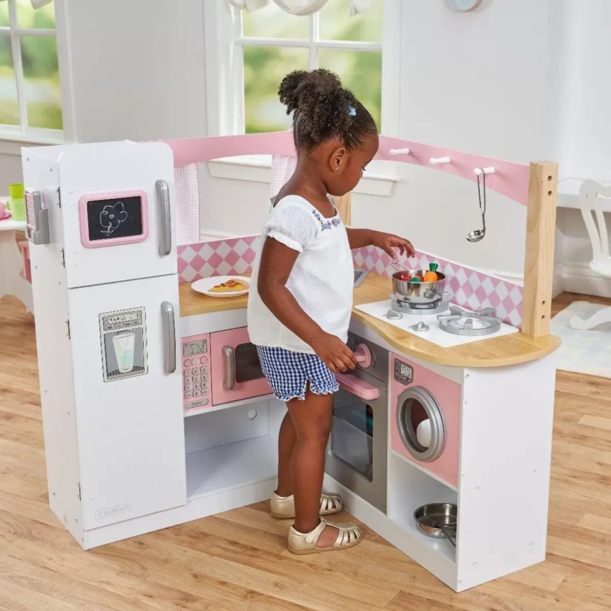 Playing With Our Kidkraft Grand Gourmet Kitchen Will Make Any Kid Feel Like A World-Class Chef! With A Four-Piece Metal Accessory Kit Already Included, Kids Can Get Started Right Away. Cloth Curtains Behind The Sink Open Up For An Imaginative View And Clicking, Turning Knobs Complete The Realistic Feel. The Innovative Corner Design In A Durable Wooden Structure Packs Plenty Of Features Into A Compact Space For Maximum Value.